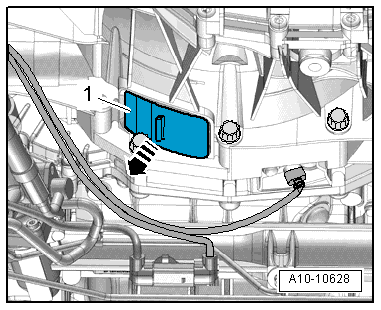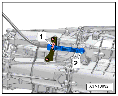 - Remove the bolt -1- press the retaining tab off the transmission and tilt it back -arrow-.