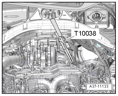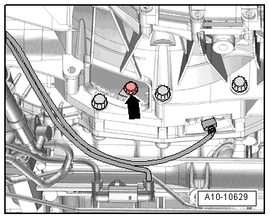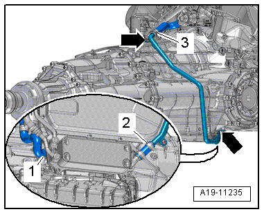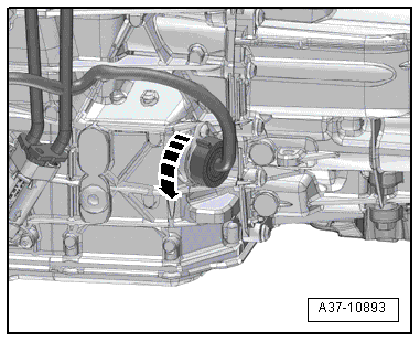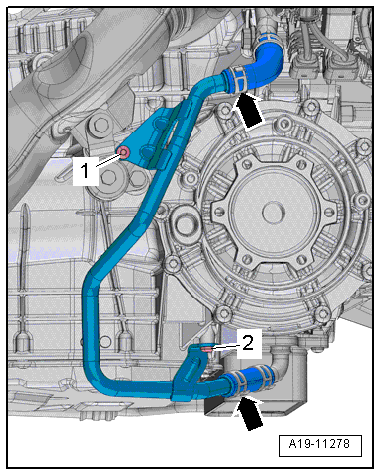 - Remove the right coolant pipe on the transmission, refer to → Rep. Gr.19; Coolant Pipes; Coolant Pipes, Removing and Installing.