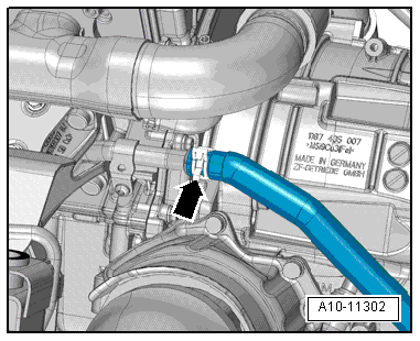 - Loosen the clamp -arrow- and remove the coolant hose from the left coolant pipe.