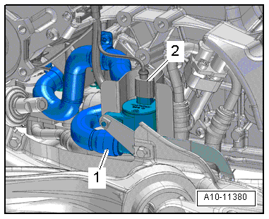 - Free up the fuel hose -1- and the hose -2- for the EVAP canister from the air guide pipe.