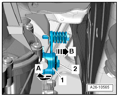 - Press the tab -1- in direction of -arrow B- and swivel it toward the rear -arrow A-.