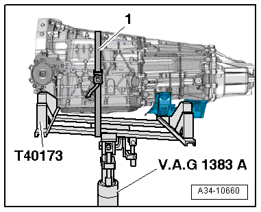 - Place the Engine and Gearbox Jack -VAS6031- with the prepared Gearbox Support -T40173- on the bottom of the transmission.