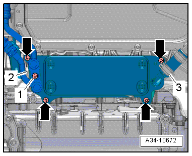 - Remove the bolts -1, 2, 3- from the lower left coolant pipe.