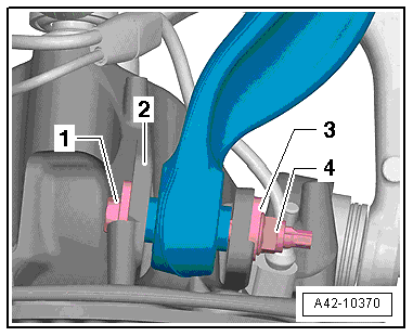 - Lift the wheel bearing into the curb weight position (refer to → Chapter "Wheel Bearing in Curb Weight, Lifting Vehicles with Coil Spring") or control position (refer to → Chapter "Wheel Bearing in Control Position, Lifting Vehicles with Air Suspension") and tighten the nut -4-.