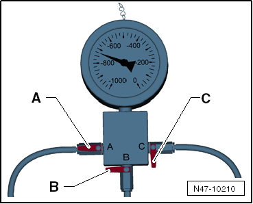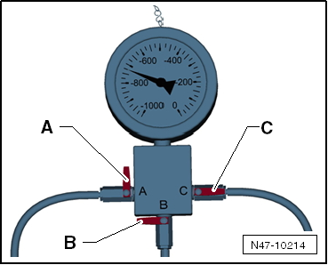 - Close the shut-off valve -C- after creating the vacuum to check the vacuum system from the Brake Servo Tester -VAS6721- up to the intake manifold or up to the vacuum pump.