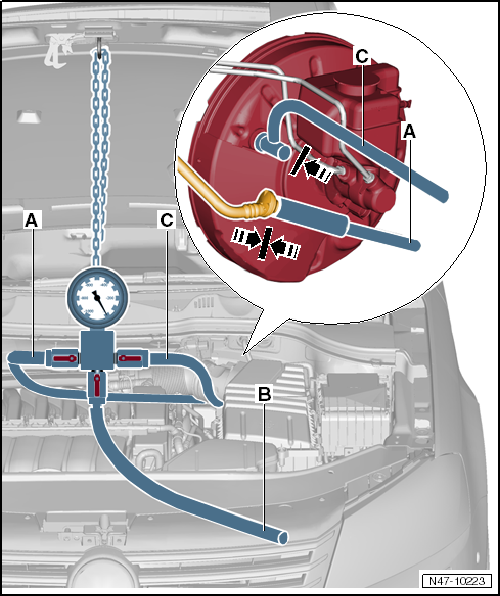 - Connect the hose -A- from the Brake Servo Tester -VAS6721- to the vacuum hose and push the adapter -C- into the brake booster.