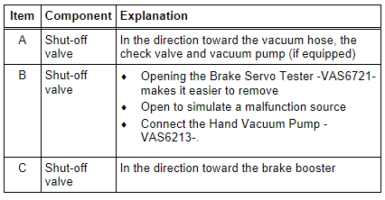 - To do so, connect the Hand Vacuum Pump -VAS6213- to the vacuum hose from the connection -B- to the Brake Servo Tester -VAS6721-.