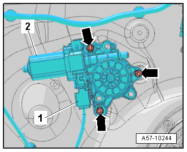 - Remove the bolts -arrows- and remove the window regulator motor -2- from the window regulator.