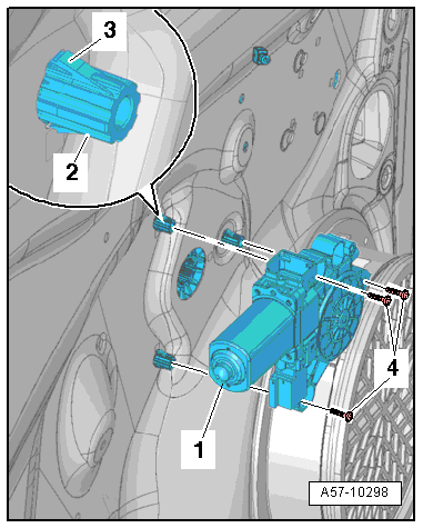 - Slide the window regulator motor -1- onto the threaded pins and tighten the bolts -4-.