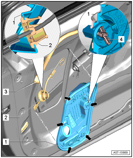 - Remove the door trim panel. Refer to → Body Interior; Rep. Gr.70; Front Door Trim Panels; Front Door Trim Panel, Removing and Installing.