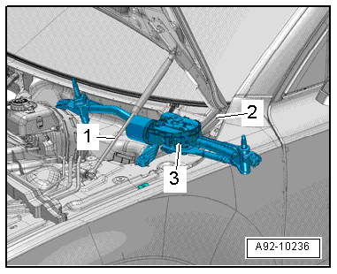 - Remove the windshield wiper frame -3- with the linkage and windshield wiper motor from the plenum chamber between the gas-filled strut -1- and the hood hinge -2-.
