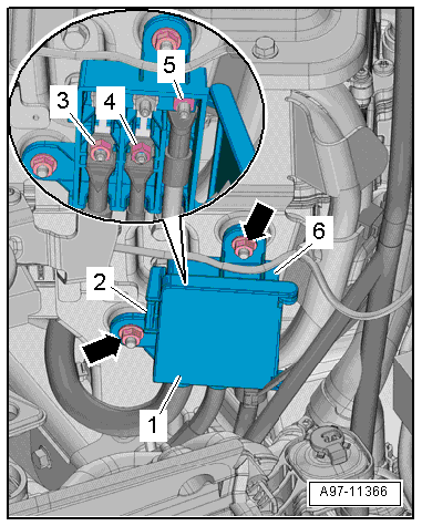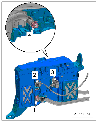 - With the ignition switched off, disconnect the ground cable from the battery. Refer to → Chapter "Battery -A- and Auxiliary Battery -A1-, Disconnecting and Connecting, Vehicles with High Voltage System".