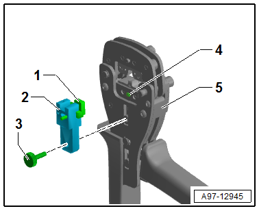 - Position the contact positioner with the contact cross bar on the crimping tool -5- at the same time push the holes in the contact positioner -2- over the knurled screw -4-.