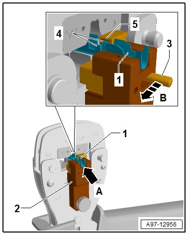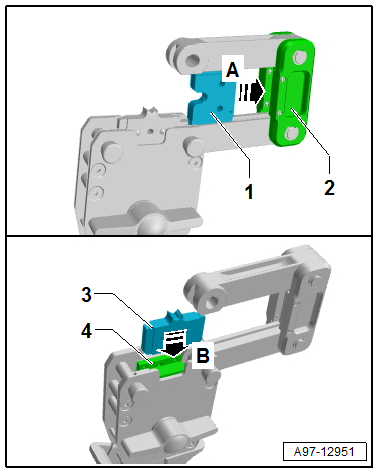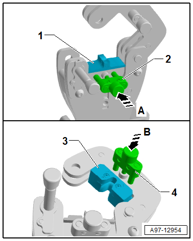 - Push in the crimp insert -3- until it engages audibly in the mount -4- of the crimping pliers -arrow B-.